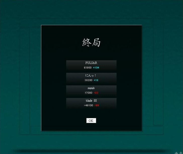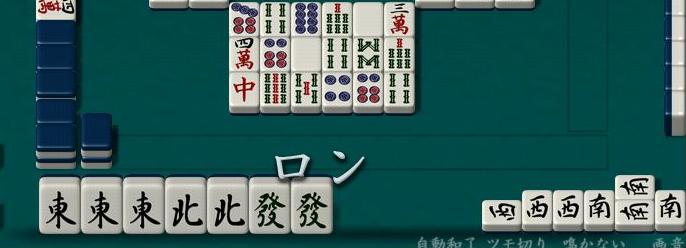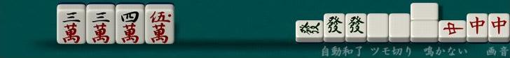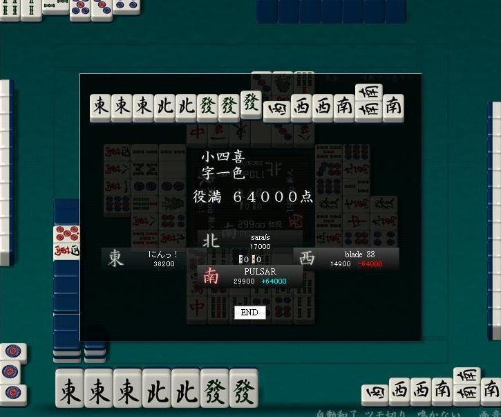 これは深夜3時に起きた出来事である いつものように天鳳で麻雀をしていた 東南戦だったのだが最初の親が連続であがり続けてて全く場が流れなかった そしてやっと東4局まできた 自分は南場、その時の配牌で、すでに半分が字牌というなんとも珍しい手だった 一打目から字一色を狙うつもりでとりあえず字牌以外を捨てる方向に持っていった 配牌で白が一つあったが、2順目3順目に他家が1枚ずつ捨てたので仕方なく白を切った その後、西 南をポンして手を染めていく しばらく無駄ヅモが続き9順目に白を引いてしまう・・・ やむをえず打白 配牌時に東を2枚持っており10順目に東をツモる イーシャンなのだがなかなかうまくいかず無駄ヅモが続く・・・ そして16順目發をツモりテンパイ 北と發のシャボ待ち・・・ 19順目、西家の打發でロン 小四喜 字一色 ダブル役満64000点 もちろん放銃した西家はぶっ飛び終局 これで人生で2度目の役満あがりとなるが 1度目のニンテンドーDSの麻雀格闘倶楽部であがった大三元は 相手がCPUだったのであまり実感がわかなかったです 嬉しい事は嬉しいですが天鳳のように相手が同じ人間の方がやはり嬉しいですねw しかしこれ、もし北であがってたら・・・((((;゚Д゚))))ガクガク んまーしかしGW中は忙しくて朝もいつもより早いから 早く寝なきゃいけなかったのに興奮して全く眠れませんでした(((ノ∀`*) ~今日のSS~ これは白捨てて正解だったのかなw