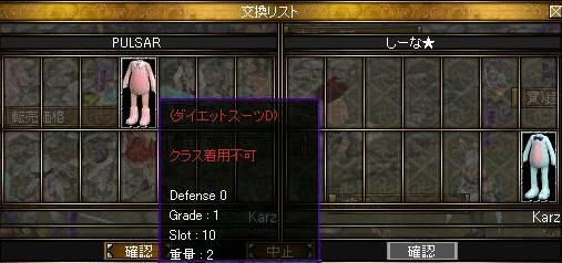 時が経つのは早いもんですなぁ(_д_)。o0○ 12月30日年明け最後の営業を終えて店の従業員と騒いだのが ついこの前のような感じがするのにもう4月も終わり5月ですよ(●´エ`●) 月も替わって心機一転今日からまた頑張ろう|ω・´ *)ノ なんて気合いれてるそばからラッキーな出来事が(((ノ∀`*)うふふ 今日は仕事が休みで午前中にやる事を終わらせて午後ちょっと気合入れて狩りましたw なかなか順調にうpしております(_д_)。o0○ 次も50Mだからサクっといきたいですね(・ω・)モニュモニュ それから今日は4月の19日に開催されたホーリデーイベントの結果発表がありました。 このイベントの1万円分マイレを入れると必ずもらえるという兎のD装備を見て一目惚れwww いれちゃいました(;゚ー゚)つ【いちまんえんw】 1万入れたからにはD装備の他にレアなエディもゲットしたいんだぜo(*゚Д゚)ノ ドキドキしながら当たったかを確認するボタンを順番に押していくと・・・ なんてこったい( θ_Jθ)bキタコレw LvHPエディ5枚げっつw しかしここで重大な事に気付いてしまうのです!! 一目惚れした兎スーツ・・・ 男性用の殺人兎スーツと女性用のダイエットスーツと2種類あり これが・・・必ずもらえるが・・・どちらかランダム・・・( ´,_ゝ`) エディションも当たりうまく男性用のスーツも引き当てる・・・ そんな事運のない星の下に生まれてきた俺には到底ありえない話しw リログして倉庫の中を見てみると・・・ そこにあった物のは!!!! ( ´,_ゝ`)ップ・・・(*´∀`)ケラケラ やぱーりな!ヽ(*´∀`)ノwww 女性用ダイエットスーツを当ててしまたw 困り果てていると俺のすぐ下で【殺人兎Dと交換おね】と女性用スーツを露店に出してる人を発見w すかさず真似して露店に出していると・・・ しーなさんからササが(;゚ー゚)コレハ・・・マサカ 粉砕!玉砕!大喝采!な予感( ゚Д゚ )b 神に思いが通じたのか殺人兎と交換して頂く事にヾ(*`ω´*)ノっふぉー やったぁぁぁぁぁヽ(*´∀`)ノ 感謝です(●´人`●)ありがとう♪ 頑張って強化しますぞー└|;゚Д゚|┘オー! ~今日のSS~ しーなさんとはいチーズ!|ω・´p【◎】qカシャ!